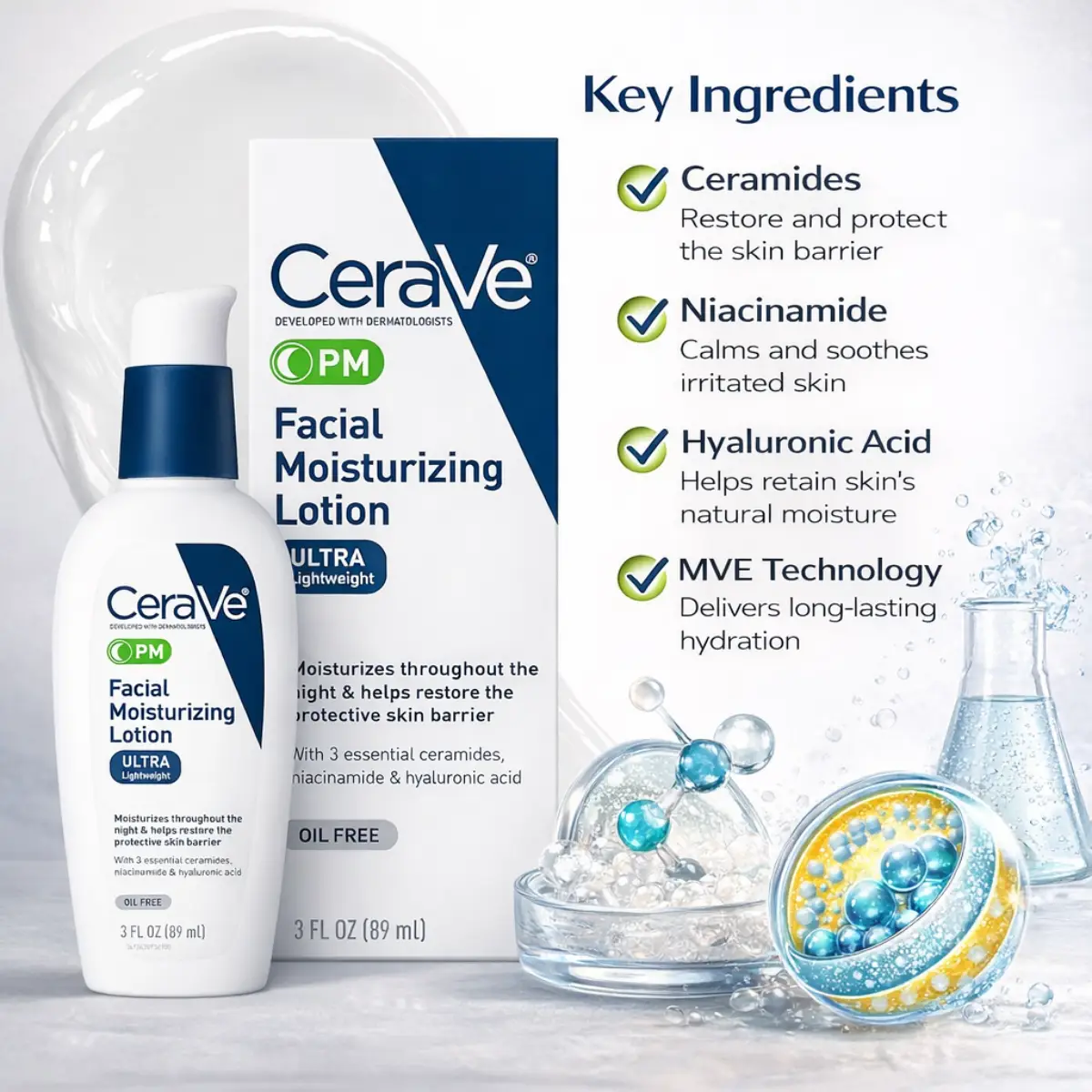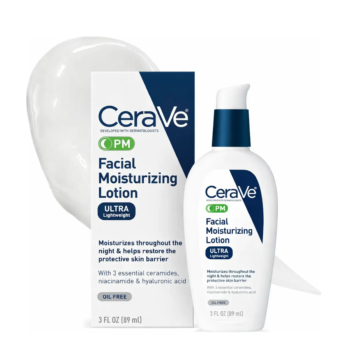 CeraVe PM Facial Moisturizing Lotion (89ml) is a lightweight night moisturizer designed to help hydrate and support the skin barrier while you sleep. Developed with dermatologists, this oil-free formula absorbs quickly and provides long-lasting hydration without clogging pores.